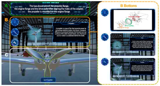 Figure 6 shows the sharing board interface of the aircraft maintenance simulation. Users can interact with areas A, B, and C.