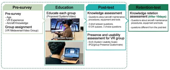 First, all participants responded to the pre-education questionnaire along with the instructions for the pre-education experiment. We collected the gender and age groups of the subjects through a demographic questionnaire and an educational pre-questionnaire. The background knowledge and VR experience pertaining to aircraft maintenance for every participant was evaluated. After completing the pre-questionnaire, the participants trained in their assigned group for 18 min. In the proposed system group, the training was paused in the event that a problem occurred, or a participant was inexperienced in the use of their VR device. In these events, a researcher partially intervened to resolve the problem and resume the training, thus ensuring a smooth educational experience. After the training session, each participant responded to a post-test. This step assessed the subject’s level of knowledge acquisition. The post-test consisted of three short-answer questions about the equipment and tools including the aircraft maintenance procedures, six O/X quiz questions, and three choice questions about how to use specific equipment and tools, for a total of 13 questions. The proposed system group also filled out the Igroup Presence Questionnaire (IPQ) to assess their sense of presence [50]. In addition, to evaluate whether the proposed system is suitable for use in education, a system usability scale (SUS) was conducted [51]. Both the IPQ and SUS were conducted using an online survey method. A retention-test was then performed to measure the knowledge retention of all subjects after 10 days. This test examines how well the knowledge acquired through education is maintained. To accurately judge the degree of knowledge retention, the questions on this test were different from those on the post-test.