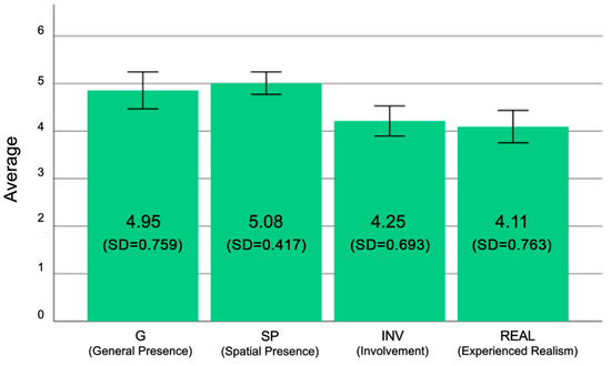 Figure 8 shows the IPQ results. SP exhibits the highest result at 5.08 points (SD = 0.417). G also has a high score, which was close to 5 points (M = 4.95, SD = 0.759). INV and REAL were 4.25 (SD = 0.693) and 4.11 (SD = 0.763), respectively, which are both above average scores. Considering that the survey was conducted on a Likert scale from 0 to 6, all values are higher than the average, which shows that a sense of presence was felt in the proposed system.