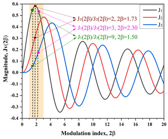 , can be adjusted by varying the PS. In addition, the ratio between the Bessel functions can be adjusted by changing the modulation depth of each DDMZM. The relationship of the Bessel functions and the modulation index are plotted in