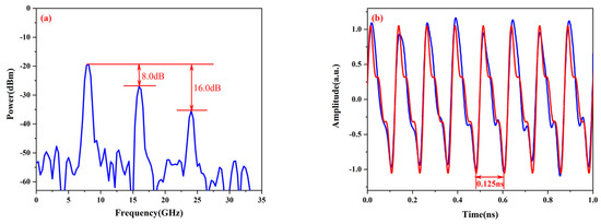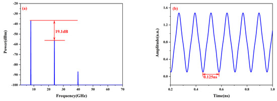 Figure 4b is the output signal waveform in the time domain, which is consistent with the waveform of the triangular signal with a full duty cycle and a repetition frequency of 8 GHz (0.125 ns).