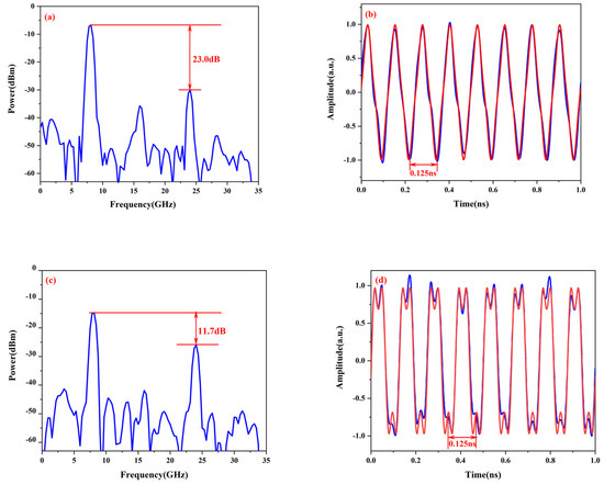 Figure 4a shows the output of the triangular waveform spectrum after PD. As we can see, the third harmonic power is 19.1 dB lower than the fundamental frequency power, which is consistent with the spectrum characteristics of the theoretical triangular waveform.