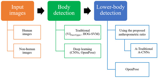 Figure 2. A person is captured or recorded by a camera, producing the input image. Then, the human body is detected and scaled using the proposed anthropometric ratios in combination with either traditional techniques (A-Traditional), such as the VJ and HOG-SVM algorithms, or the CNNs technique (A-CNNs). Finally, the lower-body area in the image is detected.