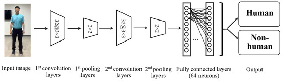 . A final fully connected layer with 64 neurons was used to classify each input image as human or non-human based on the softmax function, as illustrated in