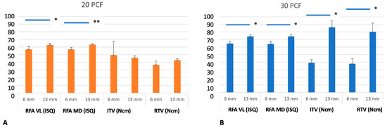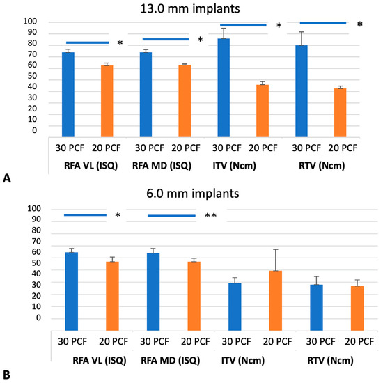 Measurements of primary stability of long implants (A) and shorts (B) implants on polyurethane blocks of 20 and 30 PCF. * p-value < 0.01; ** p-value < 0.05. RFA-VL = vestibulo-lingual resonance frequency analysis (ISQ); RFA-MD = mesio-distal resonance frequency analysis (ISQ); ITV = insertion torque value (Ncm); RTV = removal torque value (Ncm).
