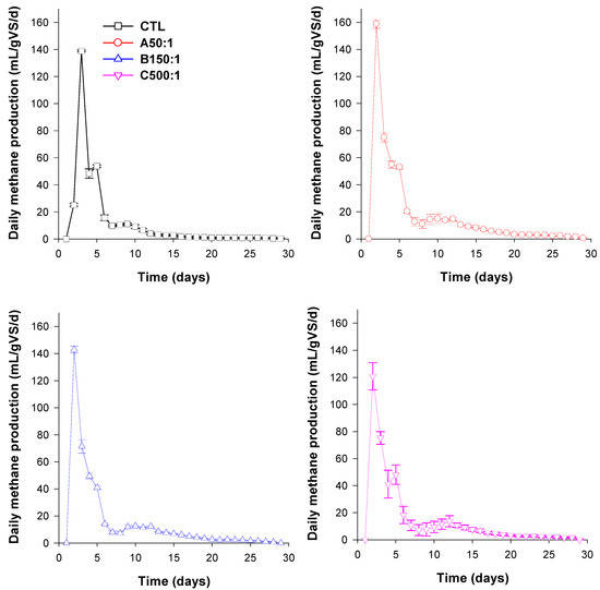 The batch AD of the silages were conducted at a mesophilic temperature of 37 °C (±1) for 28 days. The highest daily methane production occurred on the first day and then fell continuously in all silages except in the CTL silage, wherein the daily methane production increased until the second day (Figure 1), an indication that the additives increased the digestibility of the substrate as also reported during the AD of straw [48] and other residues [12]. Probably due to the depletion of nutrients, the methane production rate declined after 15 days and the experiment was stopped after 28 days, in accordance with the VDI 4630 [49] methodology.