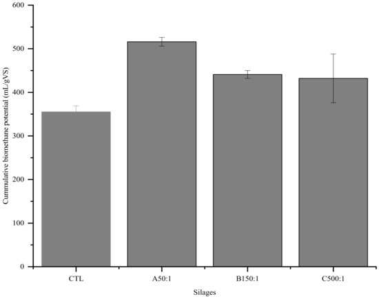 The additive used in our study had a positive significant effect (p < 0.05) on the BMP of the silages in direct proportion to the substrate to additive ratio (Figure 2). However, only the BMP of A50:1 silage was significantly higher (p < 0.05) than the BMP of the CTL silage. The A50:1 silage had the highest BMP of 516 mL/gVS, followed by the B150:1 silage (441 mL/gVS) and C500:1 silage (432 mL/gVS), representing increases of 45.35%, 24.23%, and 21.69%, respectively, compared to the BMP of CTL silage. The higher BMP of the treated silages compared to the CTL could be attributed to the higher TFP content of those silages [7].
