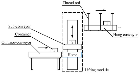 The lifting module serves to move the container in upward and downward directions, as shown in Figure 1. The module is driven by vertical chain transmission, carrying a sub-conveyor fastened to its actuator to guide the containers into the suspended conveyor system. The travel distance of the lifting module is 3 m, which ensures its sub-conveyor aligns with the overhead conveyor system as well as maintain enough space for the operating area on the floor.