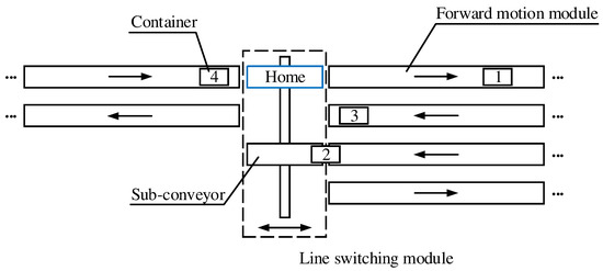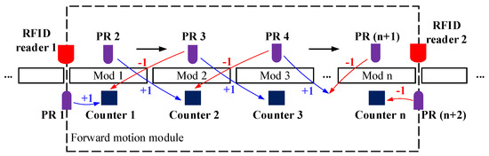 As mentioned above, the forward motion conveyor module consists of many small sizes of forward motion conveyors to arrange a proper line. With multiple component conveyors, the module can certainly transport many containers at the same time. Two RFID readers are placed on both two ends of the modules to help identify a container entering or leaving the module, as shown in Figure 10. Moreover, these RFID readers can determine the number of containers on the module at any given time.