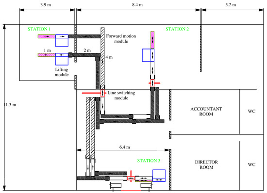 The area of the Bach Khoa Research Center for Manufacturing Engineering (BK-RECME, Ho Chi Minh City University of Technology (HCMUT), Vietnam) is depicted in Figure 3 with three simulated stations. The element conveyors are designed with the standard length of 1 m, 2 m, and 4 m to determine a completed structure of the forward motion module. The forward motion modules will then be combined with other mechanical modules to design the absolute system.