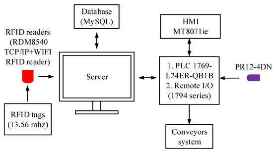 - The control model: As shown in Figure 4, the interaction between the server, the PLC, the access to the database, and the signal receiving unit (sensors and RFID readers) will also be evaluated through the experiments.