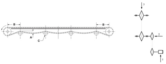 The structure and principle diagram of the chain-conveyor [11], with A and B being the designed distance between the driven shaft and the roller C. Items (1), (2), and (3) are the driven motor, the chain transmission, and the chain-conveyor respectively.