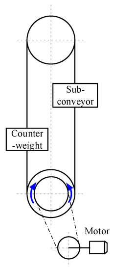 In the lifting module, there are two separated mechanical components, which are the chain drive for upward and downward motions, and a sub-conveyor mounted on the actuator. The chain drive uses a counterweight on the opposing side of the actuator to balance and reduce the motor’s torque required, as illustrated in Figure 6 and Figure 7.