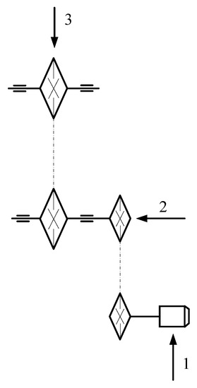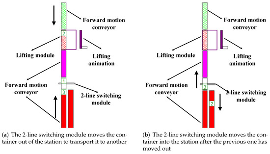 The two modules (the lifting module—Figure 12 and the line switching module—Figure 13) are controlled in a sequential manner. The transportation sequence will be considered as follows: