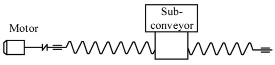 Figure 5 describes the mechanical principles of the plastic chain-conveyor, from which (1), (2), (3) are the electric motor, the chain drive, and the chain-conveyor, respectively. The design of a slat top chain-conveyor is selected based on [11]. The preliminary design parameters are the average speed: v = 0.4 (m/s); maximum workload: m = 7 (kg), including the weight of the product.