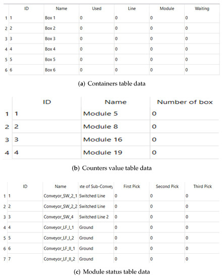 The RFID signal affects the control operation of the system, i.e., the processing of the server. As for the ATS system, when the signal from the RFID reader is lost, the system will stop (because the scan loop confirming the connection between the RFIDs is performed continuously). The data of the goods are name, location, path, etc. The data of the conveyor module comprise the states, number of consignments, etc. The data of RFID states are connection state, reading state. All three types of data mentioned above are stored in a database and are accessible through GUI. If the system is detached from the RFID signal, the user can navigate the location of the disconnected RFID signal. The detail of the storage of data in the database is mentioned in Section 3.2.1.