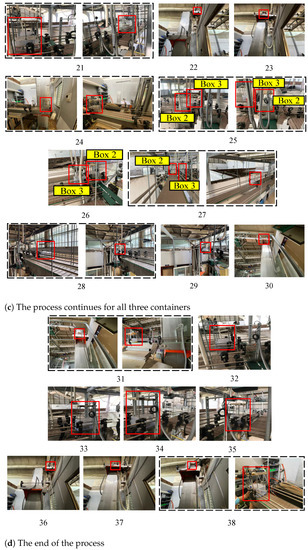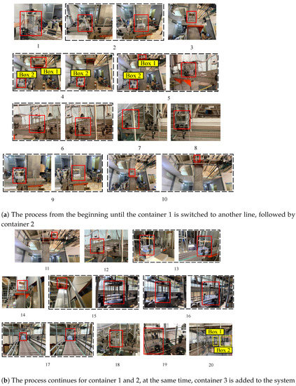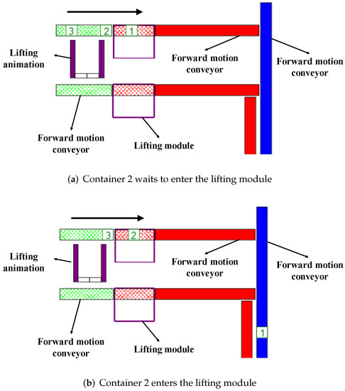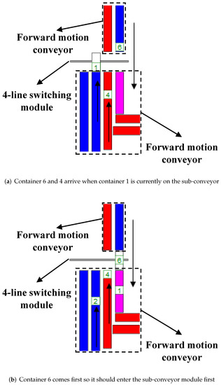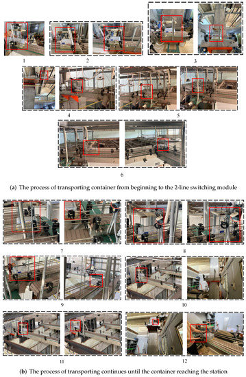 - As for the experiment (b) in Section 3.3, we provide a series of figures regarding the experimental process of transporting with three containers corresponding to any three routes. It shows that the algorithm solved the problems, such as waiting when another container was already in position and the lifting module or switching module is unavailable. The algorithm takes the priority order at the 2-line and the 4-line switching modules into account, in which the containers that come first will be moved in first. The result shows that the proposed control algorithm is effective.