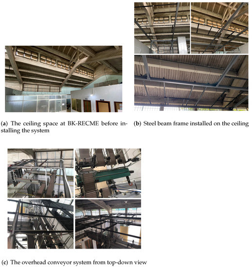 As mentioned, the overhead conveyor system is designed to utilize the ceiling as its workspace. In Figure 9, the arrangement of the overhead system is represented. Threaded rods allow the conveyor support frame to be adjusted to calibrate the height between the conveyor surfaces.