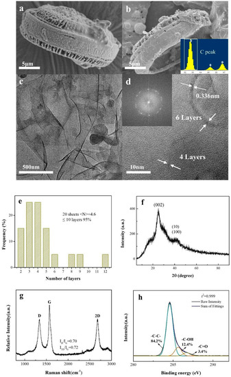 Figure 1f displays the PXRD pattern of the as-prepared graphene layer. Diffraction peaks, (002) at 25.9° and (10), (100) at 41.9°, can be observed, and these peaks correspond to the hexagonal graphite structure and the combination of turbostratic graphite and crystalline graphite, respectively [32]. The d-spacing of the (002) peak corresponds to an interlayer spacing of 0.34 nm, which was consistent with the HRTEM results. The average number of graphene layers per stack (n) could be calculated by the Bragg equation and Scherrer formula [33,34]. The value n of the synthesized graphene was about 2.7, indicating that most of the graphene with only a few layers formed during the pyrolysis and that the layer number was less than that determined by other reported methods [25,35], a finding that is in good accordance with the HRTEM results that were previously observed (Figure 1d,e). The Raman spectra (Figure 1g) showed three peaks at 1335 cm−1, 1569 cm−1, and 2682 cm−1, corresponding to the D band (structural defects and partially disordered structures of the sp2 carbon), G band (first-order scattering of the E2g vibrational mode of the sp2 carbon), and 2D band (second-order vibration caused by the scattering of phonons at the zone boundary), respectively. The intensity ratio of peak D to peak G (ID/IG = 0.70) indicated the few presence of disordered and randomly arranged graphene sheets in the products. The intensity ratio of 2D peak to G peak (I2D/IG = 0.72) implied that the products only had a small number of graphene layers, which was in accordance with the HRTEM and PXRD results (Figure 1d,f). XPS measurements were used to further investigate and characterize the defects of the structure. The results showed that graphene surface mainly consisted of carbon elements (94.39 wt.%) and oxygen (5.61 wt.%). The XPS spectra of the C1s were curve-fitted into three individual peaks (Figure 1h): the graphitic carbon (284.6 eV), C-OH (285.6–285.8 eV), and C=O (286.6–286.8 eV) peaks. The chemical component and oxidation state of carbon were mainly graphitic carbon (84.2%), C-OH (12.4%), and small amounts of C=O (3.4%).