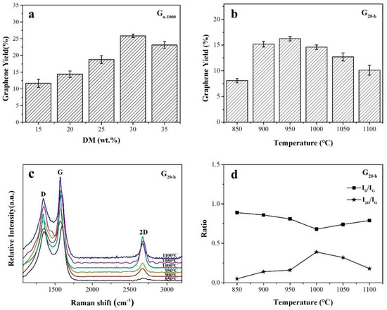 Figure 2a shows the influence of the DM content on the graphene yield via the pyrolysis of the DM/PP composites at 1000 °C. When the DM content was not more than 30 wt.%, the graphene yield (Ga-1000) demonstrated an obvious increase with DM content, which was attributed to there being more interface area between DM and PP. The highest yield (25.86%) was gained from DM/PP-30 and was higher than that observed in other reported methods [30,36]. However, when the content increased further, the yield decreased slightly, which could be the result of the large amount of DM congregation in the composites and the reduced interface area, leading to a reduction in the catalytic efficiency. The Raman spectra of Ga-1000 (not presented here) were similar to those of the products obtained from the commercial PP chips (Figure 1g), indicating that the DM content had little effect on the graphene structure. The pyrolysis temperature is another main factor affecting graphene formation. When the temperature was less than 800 °C, no graphene was obtained. Figure 2b displays the yields of the graphene products obtained by pyrolysis of DM/PP-20 under different pyrolysis temperatures. It can be observed that the yield greatly increased from 8.10% to 16.25% as the temperature increased in the region of 850~950 °C. When the temperature increased further (1000~1100 °C), the graphene yield (G20-b) decreased, something that was attributed to graphene’s decreased nucleation density at higher temperatures. These results are consistent with the results that were previously reported in the literature [37,38]. Thus, higher temperatures do not facilitate graphene formation [39].