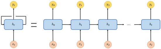 LSTM is the architecture of a recurrent neural network (RNN). An RNN is a neural network having a recurrent structure of output and input. Figure 1 shows the basic structure of an RNN. When a sequence with a large number of time steps is used in an RNN, the initial values decrease by the chain rule. This is because the values between −1 and 1 are multiplied by the hyperbolic tangent function (tanh) in the back propagation through time (BPTT) used for training as the network becomes deeper. Therefore, an RNN involves the problem of information loss because the initial input data do not influence the output results owing to the vanishing gradient problem.