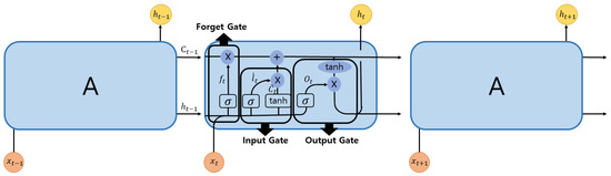 An LSTM with a structure more complex than that of an RNN was proposed to solve the long-term dependency problem of an RNN. An LSTM consists of an input gate, forget gate, and output gate for preventing information loss. The sigmoid activation function outputs a value between zero and one to determine the amount of information based on the output value. Thus, it can add or remove the information of the cell state. The sigmoid and hyperbolic tangent functions are used as the activation functions of an LSTM. The input gate determines whether new information is saved in the cell state, whereas the forget gate determines whether past information is deleted from the cell state. Meanwhile, the output gate determines which information is to be output from the cell state. Figure 2 shows the structure of an LSTM.
