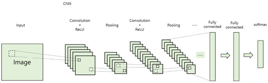 A CNN is a type of deep learning architecture. It is most widely used for image and time-series data. A CNN is a highly appropriate architecture for analyzing and processing 2D data because features are extracted from input data through convolution products. A CNN consists of a repeating convolutional layer, ReLU activation function layer, and pooling layer. Figure 3 shows the basic structure of a CNN.