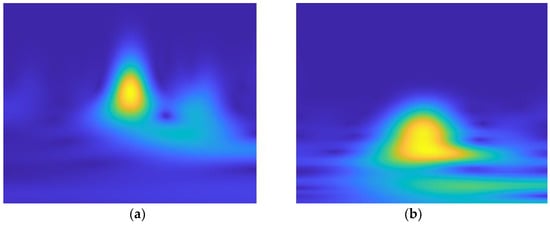 Figure 7 shows the Morse wavelet according to when = 3. Here, Figure 7a shows the Morse wavelet transform result when = 10, whereas Figure 7b displays the Morse wavelet transform result when = 60. Based on Morse wavelet (3.10) and Morse wavelet (3.60), it can be concluded that Morse wavelet (3.60) has a higher frequency resolution than Morse wavelet (3.10).