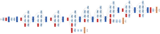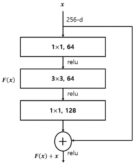ResNet-101 includes 104 convolutional layers and consists of 33 hierarchical blocks. A block consists of a 1 × 1 convolution product, 3 × 3 convolution product, and 1 × 1 convolution product. Here, the operation can be reduced by a bottleneck layer. A residual connection is also added to solve the vanishing gradient problem. x is expressed as P(x) = F(x) + x because it is added to the output through residual connection. Thus, the vanishing gradient problem can be resolved, and a more remarkable performance can be achieved through deeper layers of a neural network [31]. Figure 13 shows the structure of ResNet-101, whereas Figure 14 shows the residual connection.