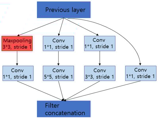 Images that are represented through time–frequency transforms such as STFT, scalogram, FSST, and WSST use a CNN, which is highly capable of image classification. A CNN can be designed directly to examine its performance. Alternatively, transfer learning including a CNN model can be used to inspect the performance. A substantial amount of data is required for training a CNN-based deep learning model. In addition, the training time is long for a complex model, where the number of layers and hyperparameters need to be adjusted according to data. Therefore, transfer learning (a CNN model) is used. Transfer learning such as AlexNet, GoogleNet, VGG, ResNet, and SqueezeNet involves training new data using a previously developed model and is applicable for cases with a marginal amount of data. GoogleNet, VGG-19, and ResNet-101 are used as a 2D transform-based CNN. As shown in Figure 10, GoogleNet is a DNN with 22 trainable layers and 9 inception models. Furthermore, GoogleNet consists of parallel convolution filters with outputs connected from the inception modules [29]. Figure 11 shows the inception module with four types of operations: 1 × 1 convolution product, 1 × 1 convolution product + 3 × 3 convolution product, 1 × 1 convolution product + 5 × 5 convolution product, and 3 × 3 max pooling + 1 × 1 convolution product. These operations are used to reduce the number of operations required by decreasing the number of parameters and adjusting the number of channels. The loss values generated during the training are added to prevent the vanishing gradient problem in DNNs such as GoogleNet.