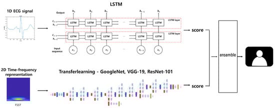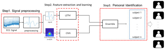 In this study, the deep learning models LSTM and 2D-CNN are combined for personal identification. The numbers of hidden layers and units are increased to enhance the classification accuracy, and LSTM layers are added to deepen the LSTM. Furthermore, 1D ECG signals are transformed to 2D data by using time–frequency representation methods. Three pre-trained CNN models (namely, GoogleNet, VGG-19, and ResNet-101) are used. An ensemble method for combining the output values of two models is used to enhance the performance of an individual model. An ensemble performs personal identification by determining the final prediction results using the output values of each model for an identical input. Personal identification using ECG can be divided into three steps: signal preprocessing, feature extraction and learning, and personal identification (see Figure 15).