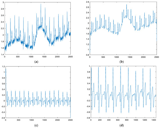 In the first step of signal preprocessing, noises need to be removed for maintaining the shape of ECG signals. This is because the signals can be distorted by various noises during measurement. In an ECG, breathing, friction between skin and electrode, noise from muscles, and noise from contact between electrode and power line are included during measurements. In this paper, the noises of ECG signals were removed using a low-pass filter. A low pass filter is a filter that passes through a frequency signal below the cutoff frequency. This filter is used to remove high frequency components such as muscle noise, 60 Hz power line noise, and electrode contact noise and to soften the signal. These noises are removed through a low-pass filter as shown in Figure 16a,b. In Figure 16b, where noises have been removed, the baseline of the signal shifts above or below the x-axis of the signal. Fluctuations in the baseline are low-frequency vibrations generated by the breathing, sweat, or movement of a subject. These cause variations in the impedance between electrode and skin. The baseline functions as the criteria for detecting characteristic points of ECG signals. Noises must be removed from the baseline because the morphological characteristics of ECG signals cannot be identified if the fluctuations in the baseline occur. Figure 16c shows the signals wherein the baseline has been calibrated with respect to zero, and Figure 16d shows the standardized signals.