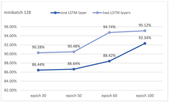 In this section, the performance of personal identification using LSTM and 2D-CNN from ECG signals is analyzed. LSTM was used for analyzing 1D ECG signals, and the performances of LSTM layer and two LSTM layers were analyzed comparatively. The initial learning rate of the experiment was 0.01. Adam was used as an optimization function for minimizing the error between the predicted and actual values. Epochs of 30, 50, 60, and 100 and a mini-batch size of 128 were applied repeatedly to examine the performance (see Figure 19). In addition, 100 hidden layers were used for LSTM. The LSTM-based personal identification accuracy for the CU-ECG database was highest (95.12%) when the epoch and mini-batch size were set to 100 and 128, respectively.