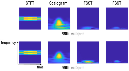 Because physiological signals such as ECG signals are affected by various types of noises, the signals were transformed into 2D images to be applied for personal identification using CNNs. Figure 20 shows the images transformed by STFT, scalogram, FSST, and WSST for a subject in the CU-ECG database.