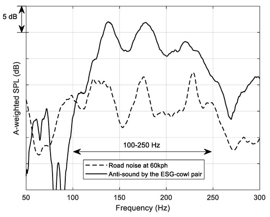 Figure 4 shows the comparison of the measured sound pressure levels (SPLs) (at the driver’s ear position) between the road noise (dashed line) at 60 kph and the practically maximum radiated sound (solid line) from the ESG–cowl pair with white noise input at the driver’s ear. It was found that the ESG–cowl pair can make a high enough anti-sound to suppress road noise above about 100 Hz. Especially, the A-weighted SPLs of the anti-sound by the pair were about 5–12 dB higher than the road noise at 60 kph for the 3 dominant resonances in the frequency range of 100–250 Hz.