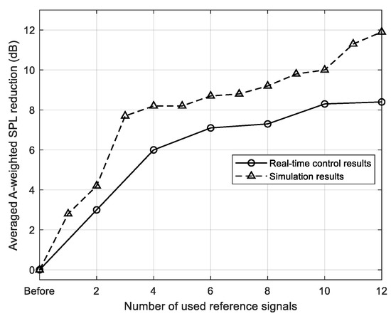 The comparison of the two lines (solid line for experiment and dashed line for simulation) in Figure 8 shows that they had similar trends that the reduction levels increased as more reference signals were used. Similar to the simulation, the slope of the reduction levels against the number of reference signals by the experimental results became less steep after the number of the signals reached a certain number, in this case, six. Especially, it was remarkable that the averaged A-weighted SPL reduction of 6 dB was achieved with only four reference signals in the ARNC experiment. This reduction level with 4 signals was just 2.3 dB less than that with all 12 signals in the experiment.