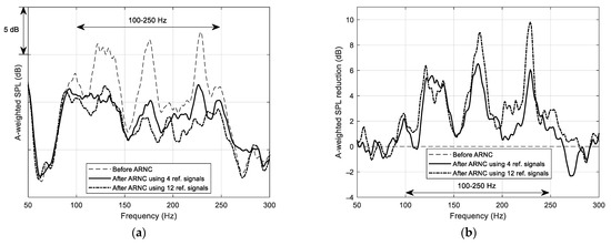Figure 9a shows the comparison of the measured results in terms of the A-weighted SPLs from “before control” (a thin dashed line), “after control with the 4 reference signals” (a thick solid line), and “after control with the 12 reference signals” (a thick dotted-dashed line) in the frequency domain. Figure 9b displays the comparison of their reduction levels after control compared to the level before control.