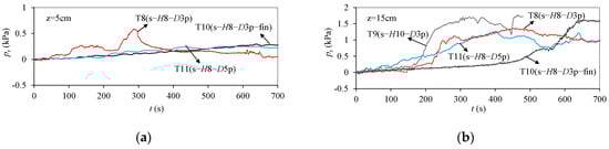 The effect of fins on the responses of pore pressure in Sample 2 seabed can be seen in Figure 11. As the depth increased from 5 cm to 25 cm, the residual pore pressure (pr) of the soil around the finned pile in T10(s-H8-D3p-fin) rose similarly to that around the normal pile in T8(s-H8-D3p), but its peak value was smaller, e.g., 45.6% lower at z = 25 cm in T10(s-H8-D3p-fin). Sample 2 seabed with higher relative density, which might be critical for fin application, allowed the fins to acquire more support from the subgrade and to stop surrounding soil from compacting. Figure 15 presents the oscillating pore pressure in T10(s-H8-D3p-fin) (po) decreasing with depth, especially in the stable response period, e.g., the mean values of amplitude at z = 5 cm were about four times those at z = 15 cm in the first 400 s and tended to rapidly develop with loading time when Sample 2 soil was close to liquefaction. Note that the amplitude of pr at z = 15 cm was even greater than the wave pressure at the seabed surface (see Figure 11b); this is because the constitution and structure of local soil had rebuilt and its particles had moved in response to periodic seepage. This alternation affected the permeability of the local seabed and resulted in a sharp secondary increase in pr.