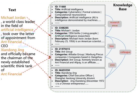The named entity linking (NEL) task refers to correctly linking entity mentions in text to entities in a structured knowledge base (such as Wikipedia, Freebase [1], or YAGO [2]), which can solve the ambiguity of mentions in natural language processing. In Figure 1, for example, a mention of “Michael Jordan” may correspond to entity entries in the knowledge base (KB) such as “Michael Jordan”, “Michael I. Jordan”, “Michael Jordan (footballer)”, “Michael B. Jordan”, etc. The entity linking (EL) involves linking the mention “Michael Jordan” to the correct entity “Michael I. Jordan” in the KB. Entity linking is also the basis of many other natural language processing tasks, such as knowledge base question and answer [3], information retrieval [4], and content analysis [5].