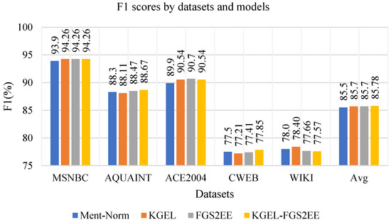 To further prove the importance of the knowledge graph structure to the entity linking, we used the KGEmbs module for a better baseline. FGS2EE [8] is an improvement of Ment–Norm [7], which introduces fine-grained semantic information into the original entity embedding to improve the model performance. KGEL-FGS2EE adds the KGEmbs module on the basis of FGS2EE. The experimental results are shown in Figure 5. We can find that for the average F1 score, KGEL-FGS2EE can further improve the performance based on FGS2EE. This shows that the KGEmbs module we proposed is effective. Similarly, the KGEmbs module can also be used in other methods. In other words, it should be useful to introduce knowledge graph structure based on other methods.