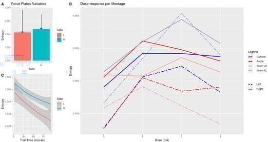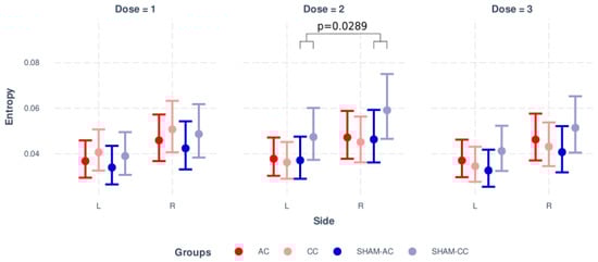 The GLMM brings the results related to montage, intensity, time, and side (complete table in Appendix A, and its Bayesian version, which also contains the effective sample size estimate in Appendix B). Fixing each intensity and observing the interaction among montages, cathodal condition up to 2 mA presented statistically different against Sham (Figure 6). The decrease in the entropy on the left platform was influenced by the flow of information from the right side. Furthermore, the time of the stimulation (duration and repetition) appeared to be an influential factor in the changes in the entropy signal.