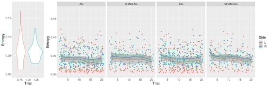 Considering a possible accumulated effect of the stimulation over our behavioral measure [], we observed the mean response of the entropy for the baseline and each pre/post-stimulation condition to analyze the carryover effect of our HD-tDCS protocol. Visually, we show a similar mean response independent of the conditions (baseline, Anodal (AC), Sham-AC, Cathodal (CC), Sham-CC) and the side of the platform (Figure 5), which suggests that our 5 min interval between each HD-tDCS stimulation was enough to avoid a carryover effect over the entropy.
