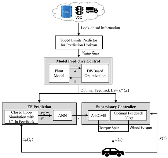 A key component of a look-ahead EMS is the use of vehicle-to-everything (V2X) communication. The authors in [6,7] showed how vehicle-to-infrastructure (V2I) and GPS signals can be used as inputs to a perception model to employ an artificial neural network (ANN) to characterize driving patterns in an optimal EMS for a plug-in HEV (PHEV). A traffic model was applied in [8] to predict future vehicle velocity with vehicle-to-vehicle (V2V) and V2I as inputs, and an optimal EMS was derived using Pontryagin’s minimum principle (PMP). In [9], traffic light signal phase and timing (SPaT) was used to give dynamic speed advice to the driver and demonstrated a FE improvement of 12–14%.
