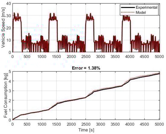 To validate model accuracy, the test vehicle was run over a team-developed drive cycle at the Transportation Research Center (TRC) in East Liberty, Ohio. Data were collected at a rate of 50 Hz using a dSPACE MicroAutoBox II with dSPACE experiment software, ControlDesk. Vehicle speed was obtained from the wheel speed sensor signal and fuel consumption from the fuel flow rate read from the engine control unit (ECU). Figure 3 shows the drive cycle and a comparison of the total fuel consumption. The final fuel consumption value obtained from the simulation is 1.38% higher than the experimental data, indicating that the model closely matches the test vehicle.