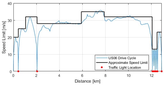 The ANN training data is generated using the optimal speed and SOC trajectories determined using DP over many trips. The speed limits and traffic light positions for the trips were generated using typical drive cycles that captured common driving types, such as highway, urban, and mixed driving. They are based off of five standard drive cycles with some modifications, namely the US06, HWFET, UDDS, NYCC, and LA92 cycles [26]. This ensures that the ANN training data is representative of realistic driving. Each drive cycle was first converted from a speed versus time plot to speed versus distance. The speed limit was approximated by matching the drive cycle with distance coordinates. Traffic lights were placed at locations where the drive cycle slows down to zero or closely approaches zero. Figure 4 shows an example of the speed limits constructed from drive cycles.