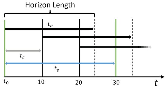 It is important to note that the objective function for MPC is expressed in distance, while in the supervisory controller, it is in time. Careful choice of horizon length, prediction update rate (), and EF update rate () is crucial for real-time implementation. A long horizon window is not practical due to the substantial computational load. Additionally, longer-term predictions are more uncertain due to uncertain future traffic. It was found that the nonlinear MPC with DP as solver can complete one optimization over 600 m in well under 10 s. Hence, the prediction horizon window is set to 600 m, and DP is recalculated every 10 s. For , an update rate that is too rapid will react to every minor change and may cause oscillations in the torque demand. On the other hand, updating too slow can cause the adaptation to become unstable and cause SOC to deviate far from the reference value. Based on this reasoning and studies found in the literature [28], s is chosen. Figure 5 shows a timing diagram of the DP-ECMS energy management system. The horizon length is converted to time, . This time is not fixed and depends on the horizon length (600 m) and the speed of the vehicle. The horizon length was chosen to be long enough so that will always be much shorter than regardless of the ego vehicle speed. This ensures that the vehicle will never travel further than the horizon length before updating the prediction.