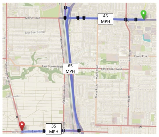 A test route chosen for a simulation study consists of both highway and city driving on local roads in Columbus, Ohio. Figure 6 shows the route on a map along with traffic light locations and speed limits. Table 3 shows relevant route characteristics.
