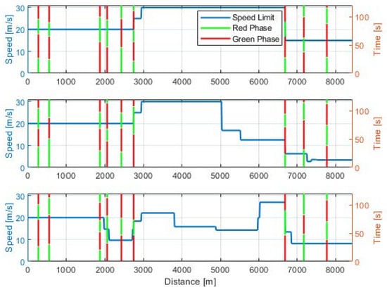 Beginning with the fixed speed limit along the route, traffic patterns typical of daily driving are randomly generated by choosing a random location along the route, a random speed which is less than or equal to the original speed limit, and a random length of speed limit variation. Along the selected route, there are nine traffic lights. A similar approach is used to randomly set the traffic light phase and timing. Examples of randomly generated speed limits over the chosen route are shown in Figure 7, where colored (green or red) vertical lines indicate the traffic light location and the phase the light is in. The size of each vertical colored segment indicates how long the phase lasts.