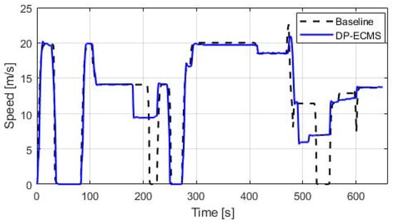 Figure 8 shows the speed profiles for both DP-ECMS and the baseline for one trip. When the vehicle is approaching an intersection during its red phase, the baseline driver initiates the stop sequence in anticipation of the red light. Since it has no knowledge of the signal timing, there is no way to determine if the light will turn green before the vehicle reaches the intersection. DP-ECMS is able to use available look-ahead data to calculate the appropriate speed to arrive at the light on green and adjusts accordingly. For all simulations, the DSRC range is assumed to be 500 m based on studies found in the literature [11,32,33]. Figure 9 shows the travel time versus the distance traveled. DP-ECMS slows the vehicle down just enough to pass through the green window when possible, while the baseline will always initiate a stop if the light is red. The travel time is approximately equal for both methods.