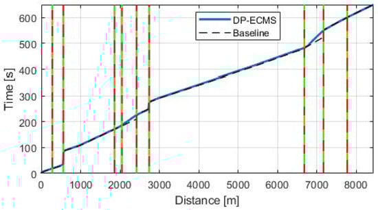 Figure 8 shows the speed profiles for both DP-ECMS and the baseline for one trip. When the vehicle is approaching an intersection during its red phase, the baseline driver initiates the stop sequence in anticipation of the red light. Since it has no knowledge of the signal timing, there is no way to determine if the light will turn green before the vehicle reaches the intersection. DP-ECMS is able to use available look-ahead data to calculate the appropriate speed to arrive at the light on green and adjusts accordingly. For all simulations, the DSRC range is assumed to be 500 m based on studies found in the literature [11,32,33]. Figure 9 shows the travel time versus the distance traveled. DP-ECMS slows the vehicle down just enough to pass through the green window when possible, while the baseline will always initiate a stop if the light is red. The travel time is approximately equal for both methods.